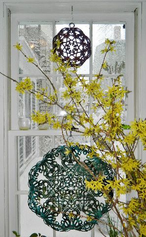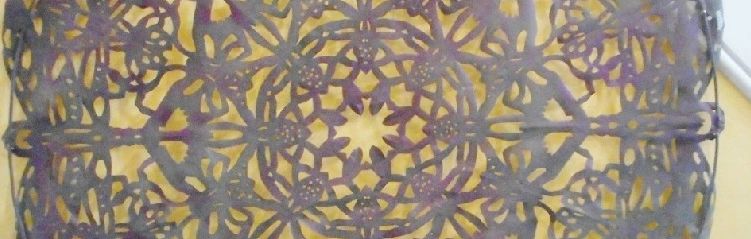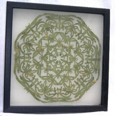 For years I've worked on various ways to display my work in windows and on a larger scale. I began to cut my circular designs of interlocking insects, animals, botanicals and trees from Tyvek house wrap (a sort of industrial plastic paper) and mounted them on wire rings. Most recently I've been cutting my designs from aluminum. It's difficult to cut the 8 layers of the Window Webs, so I've gone back to designs folded just 4 or 2 times. Displayed in windows, the silver aluminum reflects the light from outdoors for high visibility. Not only humans, but birds can see the bright light reflected in the windows and so may be useful as 'bird alerts'. Bookmarks and wall hangings are painted with dark metallic paint on one side for strong visual contrast for display.